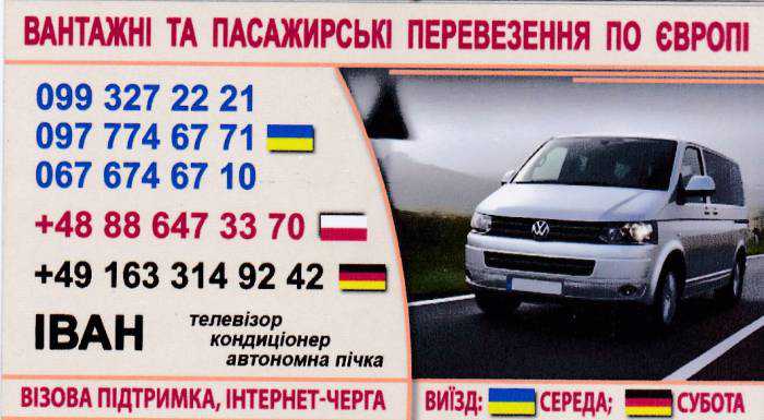 Здійснюємо міжнародні перевезення пасажирів та невеликих вантажів до Польщі(Краков, Вроцлав) та Німеччини. (Дрезден, Берлін, Гамбург, Ханновер) ВиЇзд з УкраЇни у середу. З Німмеччини у суботу.