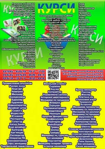 Курси перукар, манікюр, кухар, зварник, електрик, слюсар, токар, тесляр, візажіст, нарощування вій, тату, маркетинг, логістика, корекція брів вій, піццеола, крою та шиття, телемайстер, автослюсар, слюсар ремонтник, слюсар інструментальник, слюсар мо…