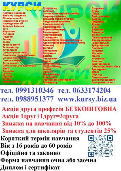 Курси перукар, манікюр, кухар, зварник, електрик, слюсар, токар, тесляр, візажіст, нарощування вій, тату, маркетинг, логістика, корекція брів вій, піццеола, крою та шиття, телемайстер, автослюсар, слюсар ремонтник, слюсар інструментальник, слюсар мо…